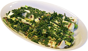Zubereitung: Porreestangen putzen, halbieren und mit Olivenöl bestreichen.