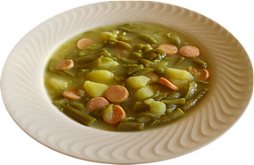 Kartoffeln schälen und würfeln. Bohnen waschen und in 2 cm lange Stücke schneiden.